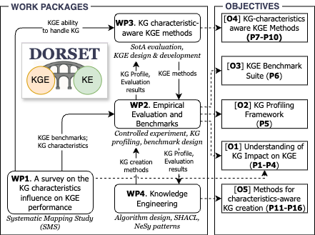 WP1 establishes the conceptual foundation through a systematic literature review of Knowledge Graph characteristics and their influence on Knowledge Graph Embeddings. Building on this, WP2 develops an empirical evaluation framework, including controlled experiments, benchmarks, and KG profiling to quantify the impact of KG characteristics. WP3 investigates and advances KGE methods by analysing their behaviour under different graph conditions and proposing characteristic-aware embedding approaches. WP4 focuses on knowledge engineering and algorithm design, translating research findings into practical guidelines for knowledge engineers.